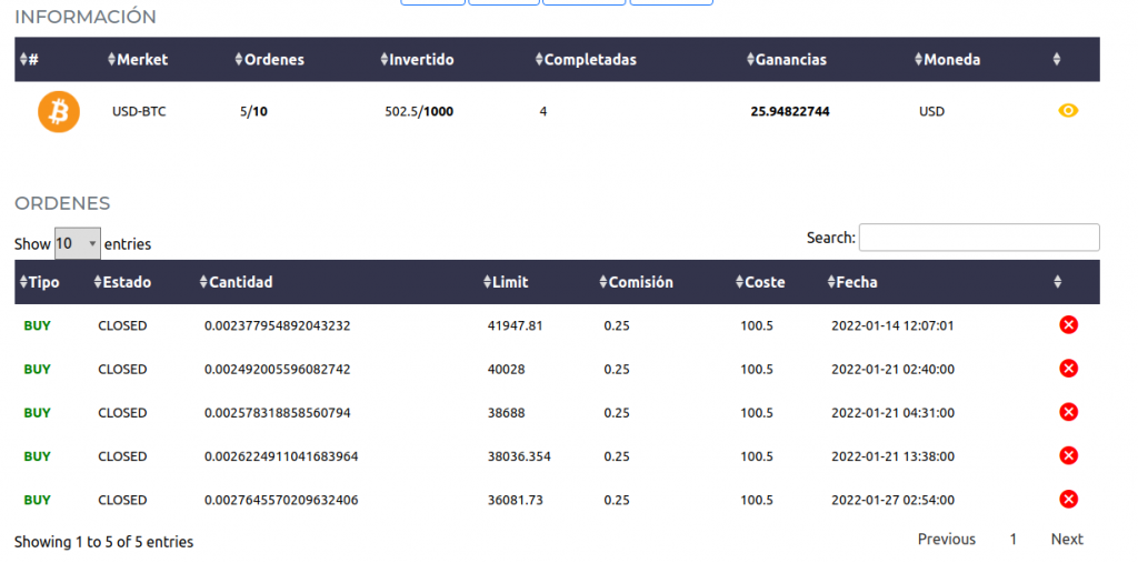 Esta plataforma ofrece la posibilidad de crear una cuenta gratuita de demostración y ademas permite configurar los indicadores de mercado y otros parámetros como el numero de ordenes, cantidad de dinero a invertir, margen entre ordenes, etc.